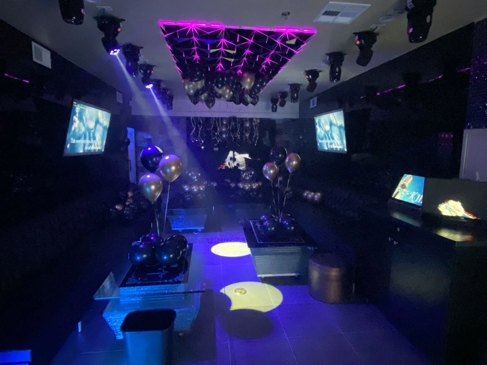 complemented by full-sized LED screens for stunning visuals. Enhance your party with customizable lighting systems and professional DJ support.